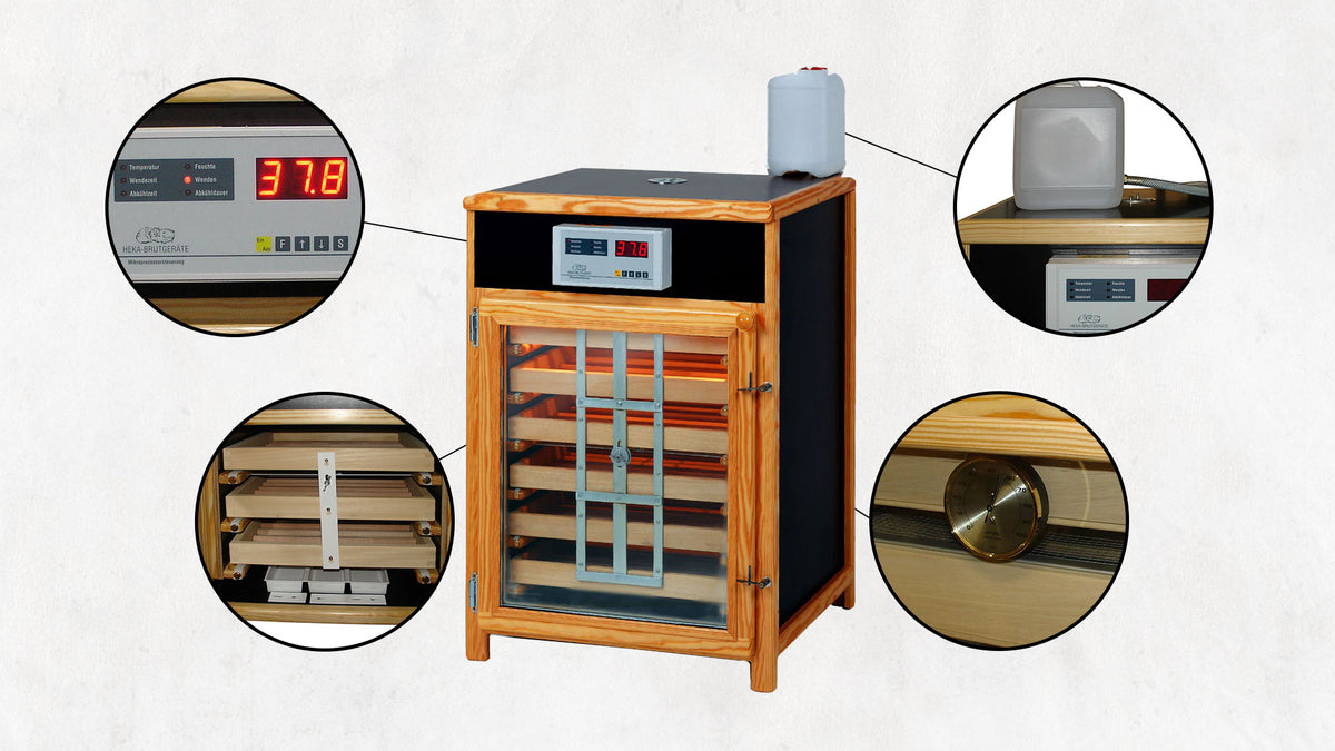 A stately device that will help you enjoy incubation and hatching even more. No matter which type of poultry, ornamental fowl, or bird you intend to breed, you are on the right track with the HEKA Euro-Lux Berlin. Highly recommended for aquatic waterfowl and ornamental wildfowl. Both the incubator and hatcher are provided with separate computer controls; This means that both compartments can be controlled and switched completely independently of one another. This is an unmistakable advantage for managing the humidity, which is considerably higher during the hatching phase than during the incubation phase. You don't have to make any compromises with this device.